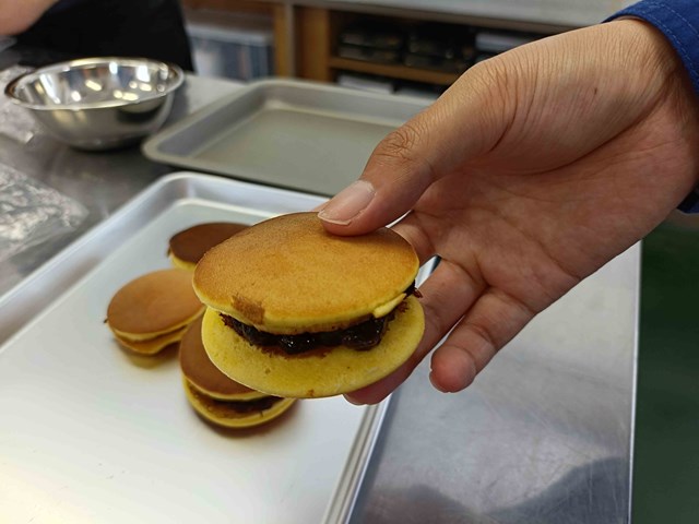 見た目が似ているどら焼きの生地とホットケーキの違いを、生地に使う小麦粉の量や柔らかさから教えて頂いたことで、生徒たちは「見た目も焼き方も似ているけど、配分の違いで食感や膨らみが全然違う!」と菓子製造の奥深さを実感しました。