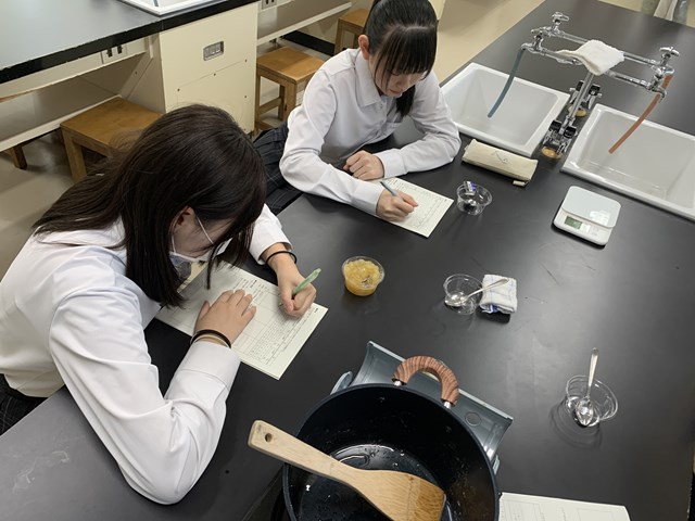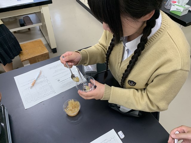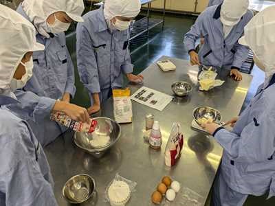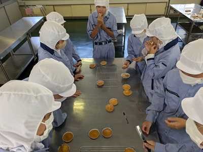 「酒粕マドレーヌ作り」では、3年生の課題研究で取り組んでいる“プロジェクト活動”で考案されたレシピを元に、酒粕入りとプレーンのマドレーヌを製造、食べ比べを行いました。