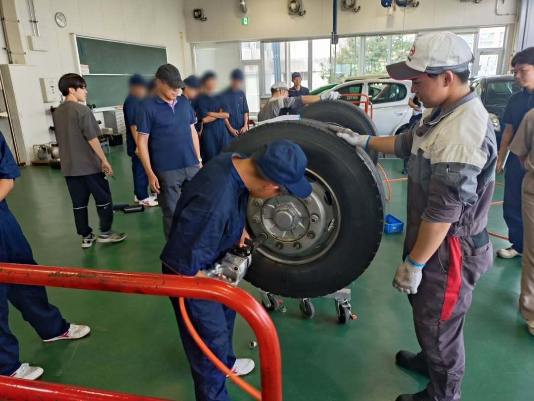 していただきました。 タイヤ交換体験では、普段の実習では使わないような大きな工具を使い、