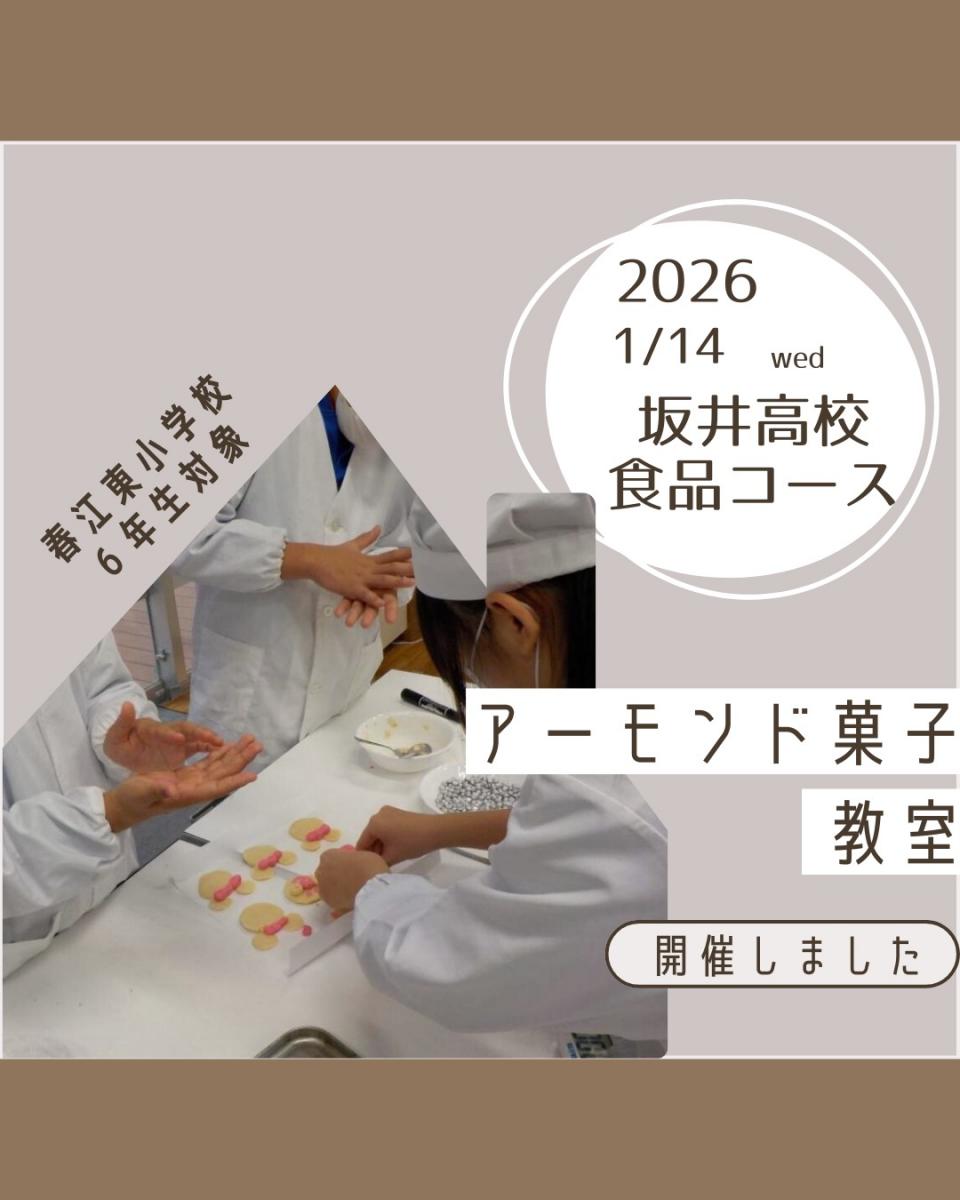 1月14日(水)に春江東小学校の6年生の生徒60名を対象に、食品コース3年生4名が講師となってアーモ