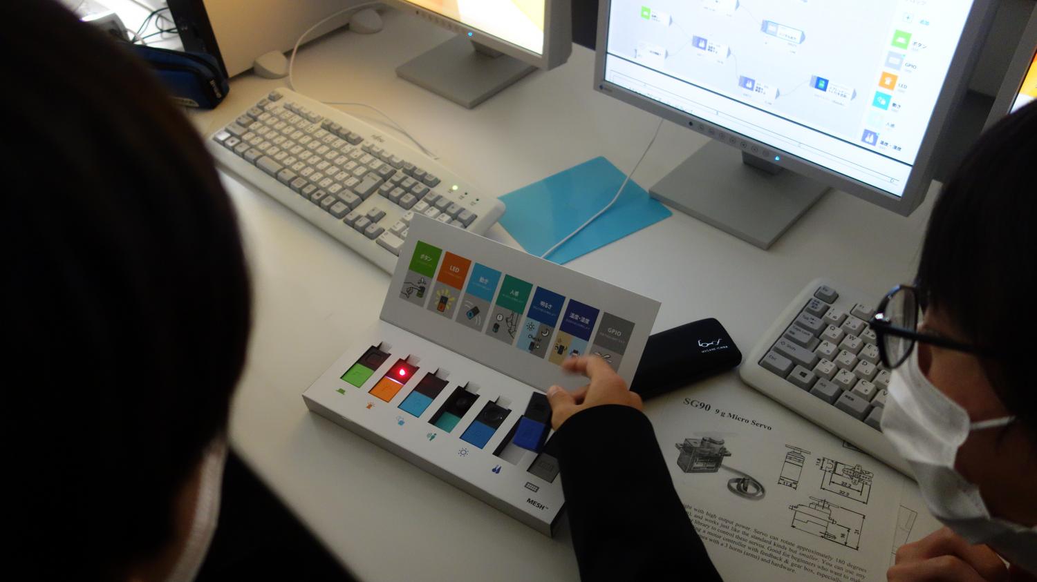 グループに分かれ行ったMESHの実技では簡単にセンサで光と音が出るので楽しい学習となりました。