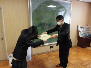 また、税に関する作文コンクールでは、昨年に続き「三国税務署長賞」に入賞し、署長様から受賞した1B生徒へ表彰状が授与されました。