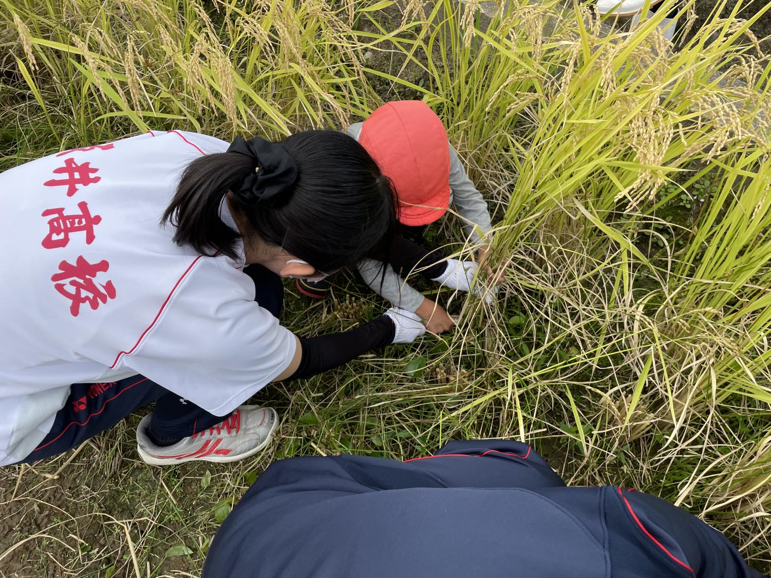 私たち課題研究の保育選択者は、子どもたちが安全に楽しく稲刈り体験ができるようにお手伝いさせていただきました。