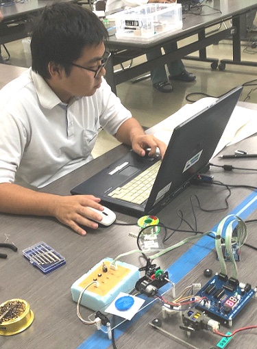 電子回路組立部門のコンテストは、限られた時間内に、ボタン、センサーなどを配置する入力回路を製作し、モータやLEDなどを制御するプログラミングを行う競技です。