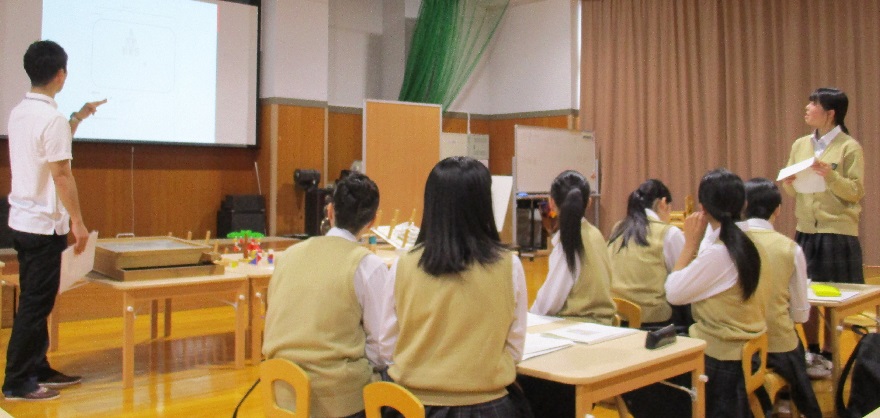 「課題研究」保育選択では、2学期に近隣のこども園・保育園の園児を学校に招待し、手作りのおもちゃで遊んでもらう計画をしています。