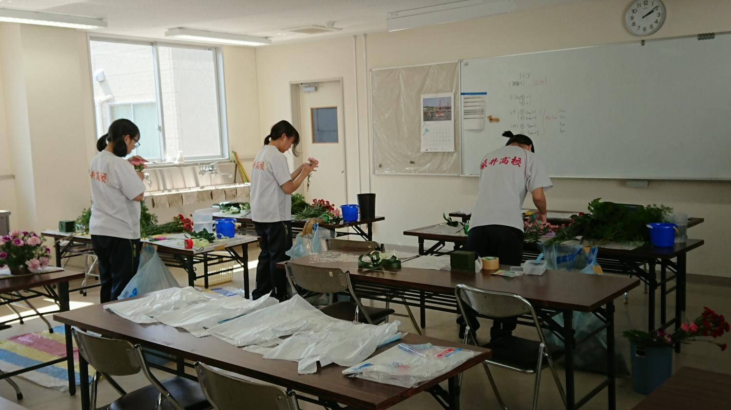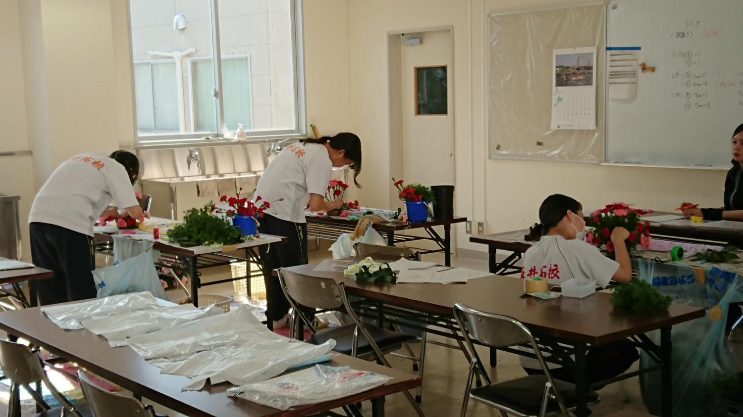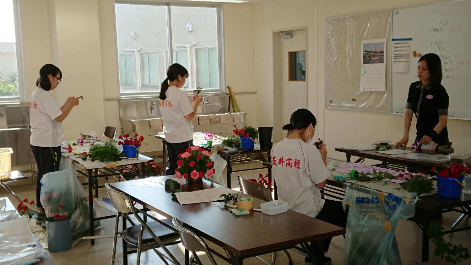 7月に9回、8月に1回、合計10回 講師として花工房の方をお迎えして3年生1名、2年生2名が受講しました。