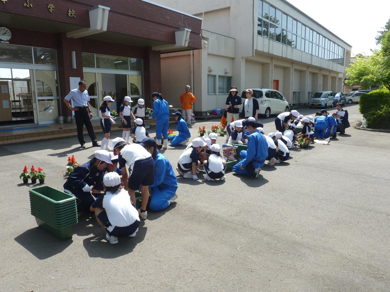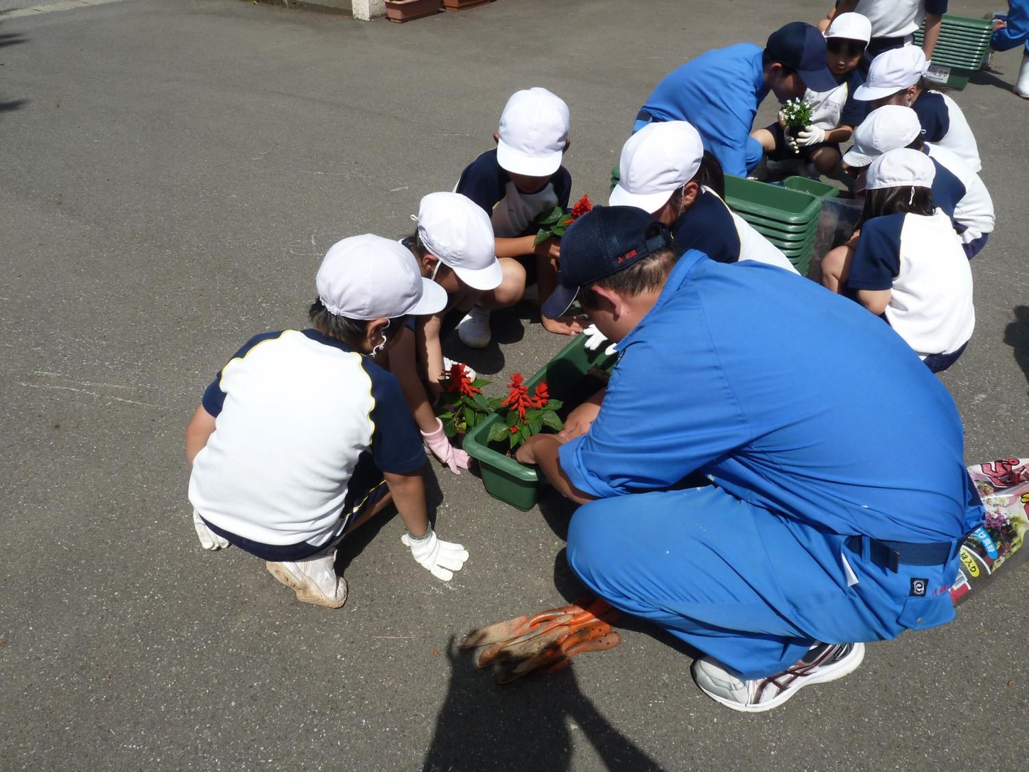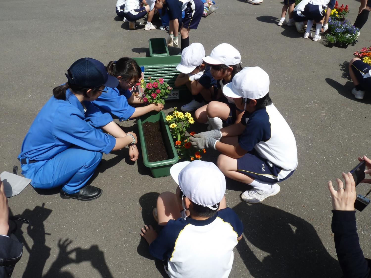 1つのプランターに3種類の苗を、高校生が小学生に手ほどきしながら40基作成しました。