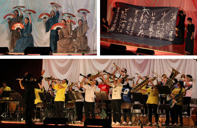 2日目の午前中は文化部のステージ発表から始まりました。上の写真は吟詠剣詩舞部、書道部、吹奏楽部です。