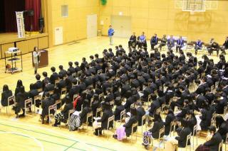 竹吉校長と生徒会長の近藤 名央さんから激励のことばがあり、