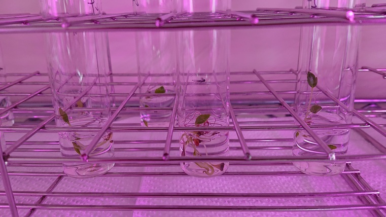 エチゼンダイモンジソウの受粉を行い、校内で採種ができました。その後、無菌播種を行い、多くの発芽が見られました。苗は順化し、屋外での栽培を行いました。