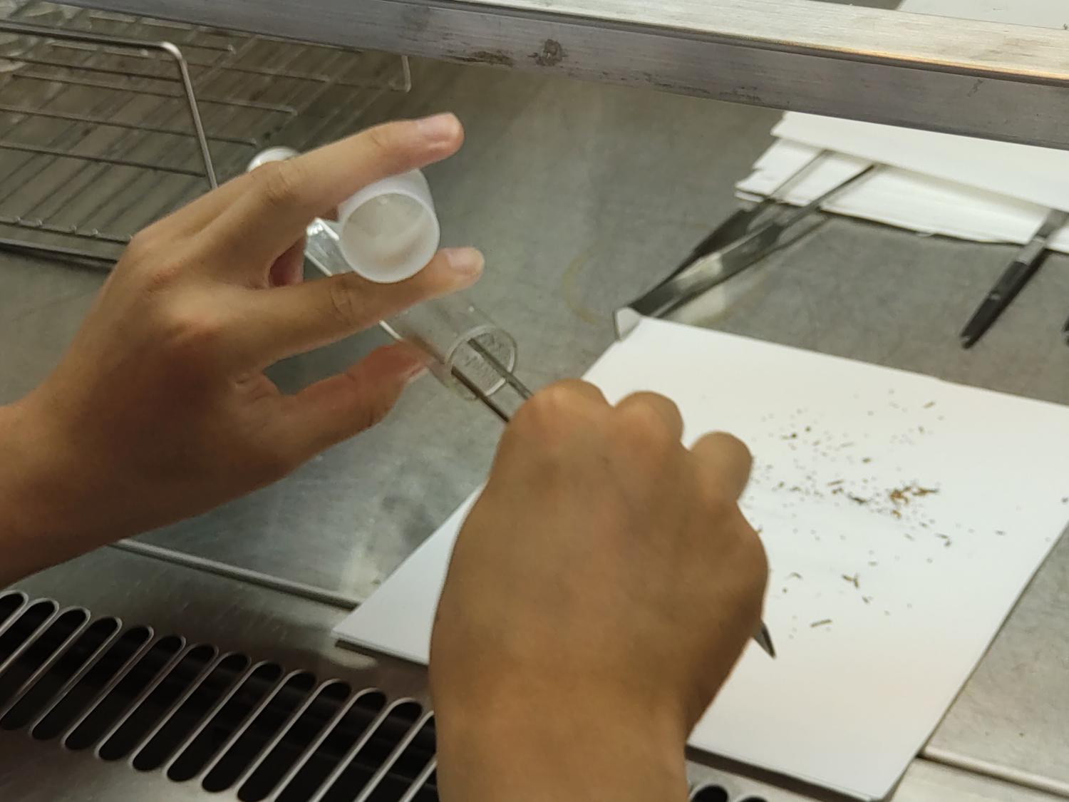 試験管に入った栄養源をゼリー状に固めた培地の上に種を無菌状態でまいています。