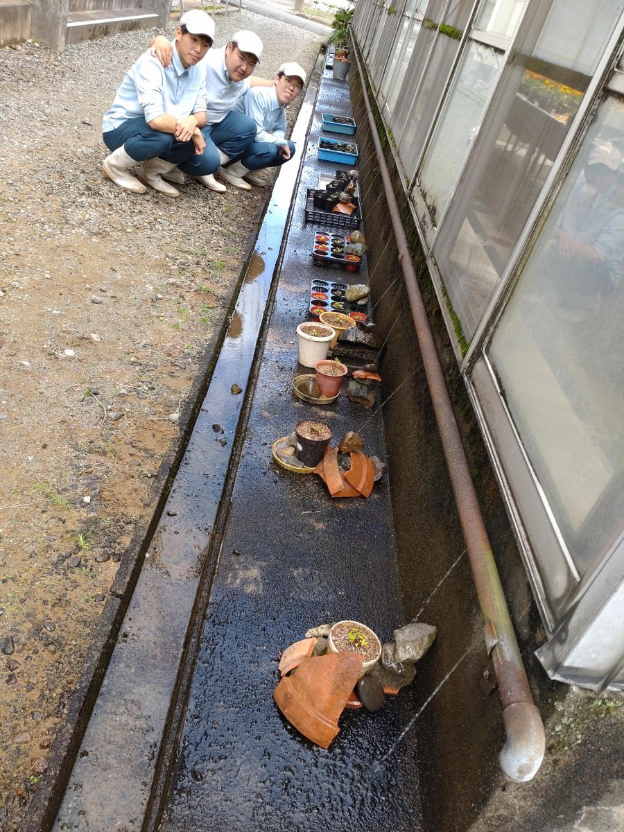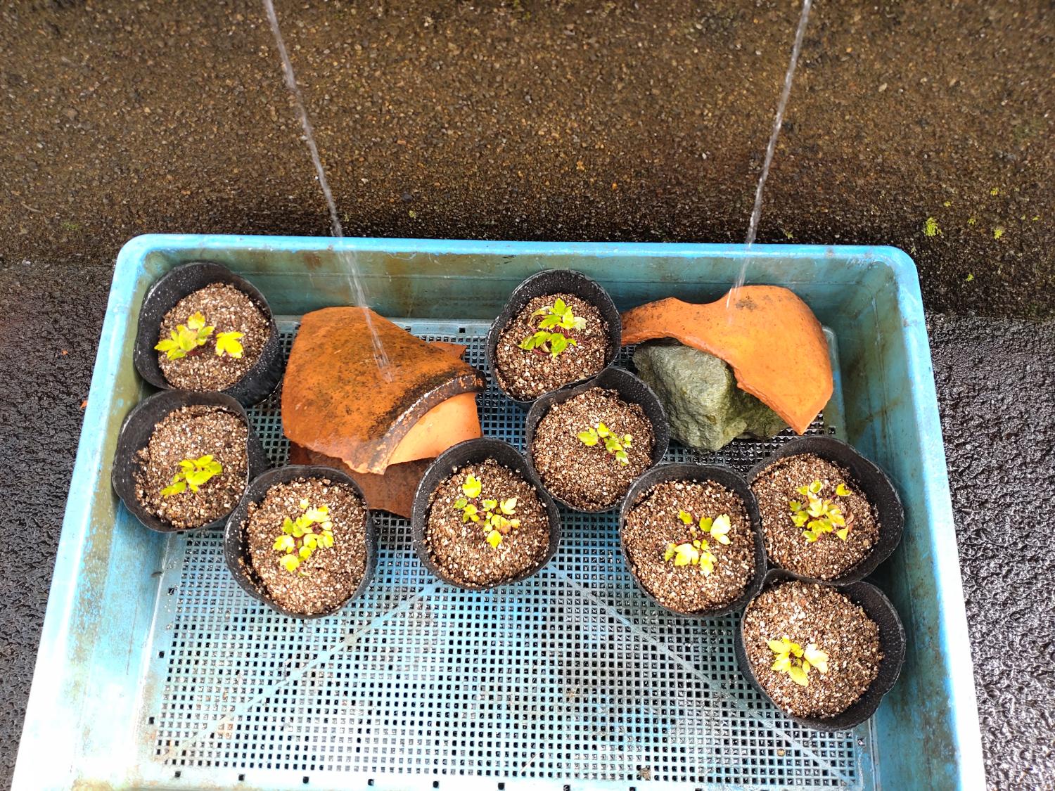 人工気象室で育苗した苗を40株ほど、域外保全区に移動させ、さらに苗を大きくします。