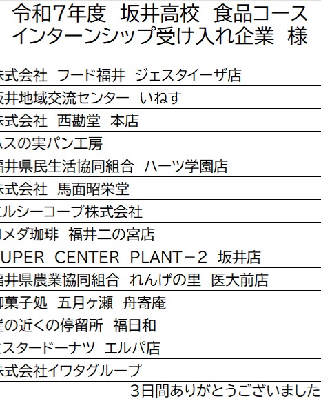 2年食品コース30名は、6月の3日間にインターンシップを行いました。