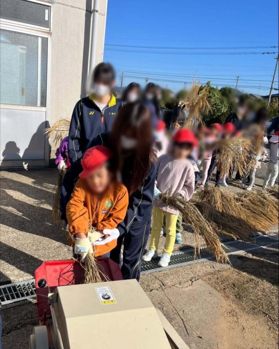 11月12日(水)10月に刈り取ったお米を、今日は園児さんたちと一緒に脱穀しました。近くの松かぜこども園