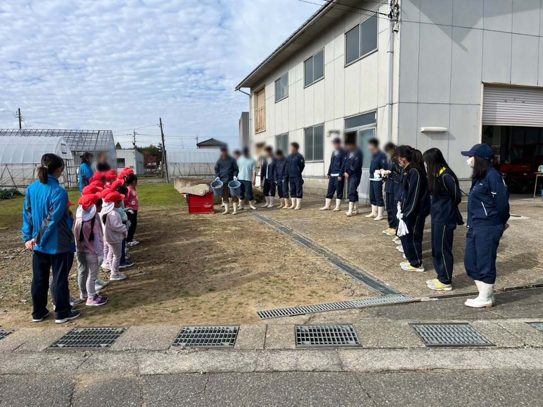 の園児を、坂井高校生活デザインコース3年課題研究保育専攻の生徒と、農業コース3年生が協力してサポートし、