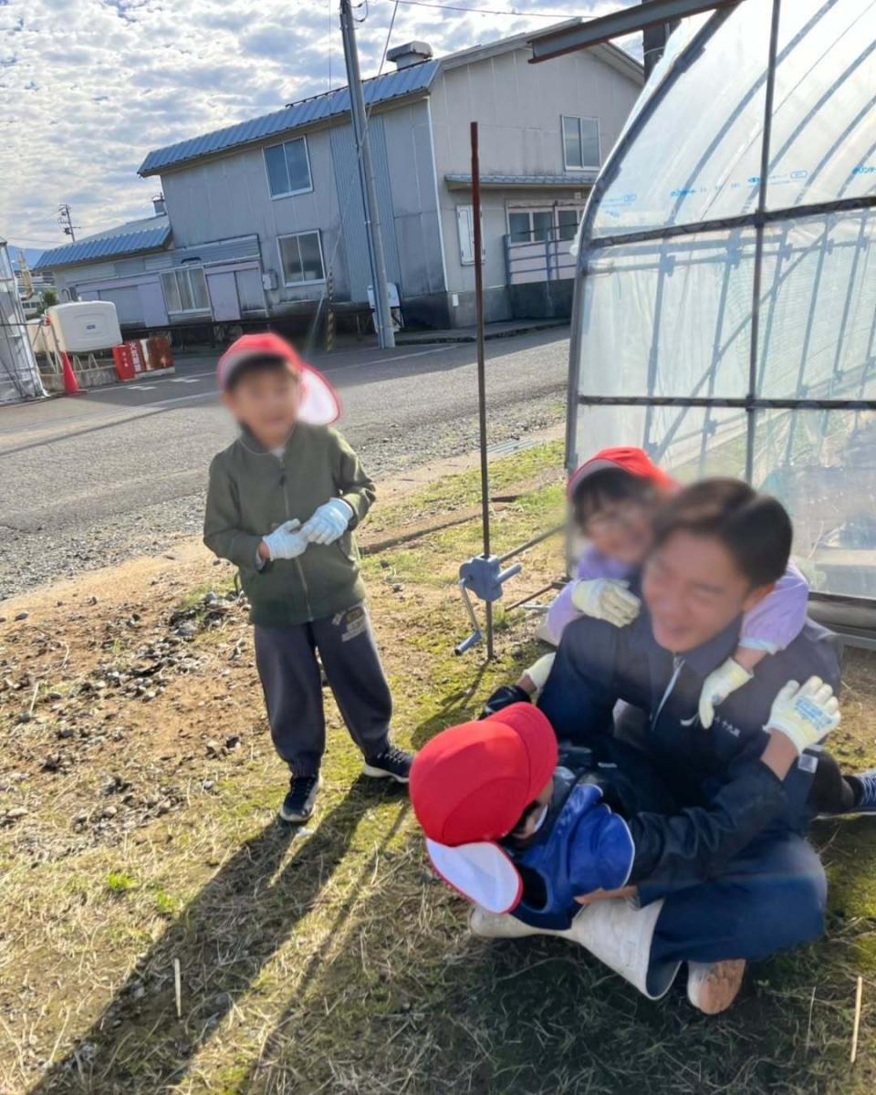 した。作業のあとは、生徒と一緒に元気いっぱい遊ぶ姿も。農業コースの生徒にとっても、普段関わることの