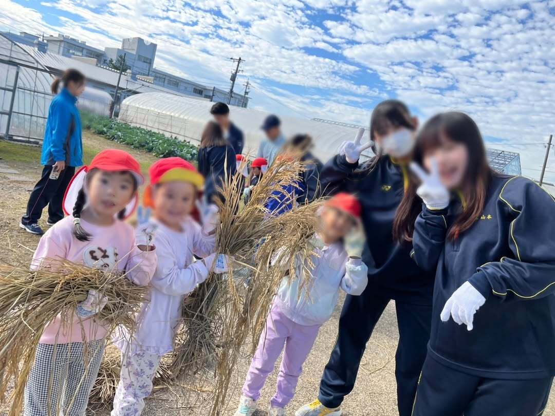 農業コースの生徒が干してあった稲を準備し、園児たちはお兄さん・お姉さんに手伝ってもらいながら脱穀体験
