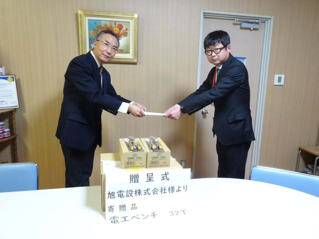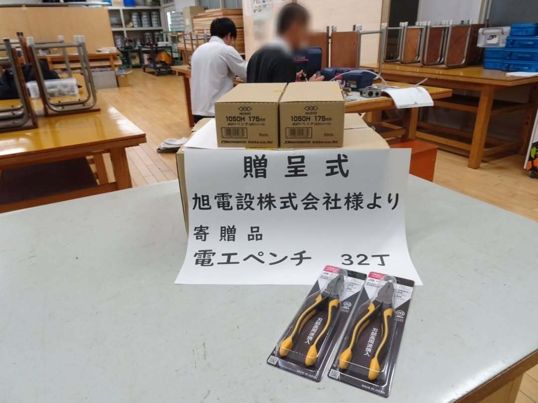 11月25日㈫旭電設株式会社さまより実習等で使用する電工ペンチ32丁を寄贈していただきました。 実習をはじ め、第二種電気工事士の資格試験に使用する大事な工具です! いただいた電工ペンチを使用して生徒たちには 存分に勉強に励んでほしいと思います! 旭電設株式会社さまありがとうございました。