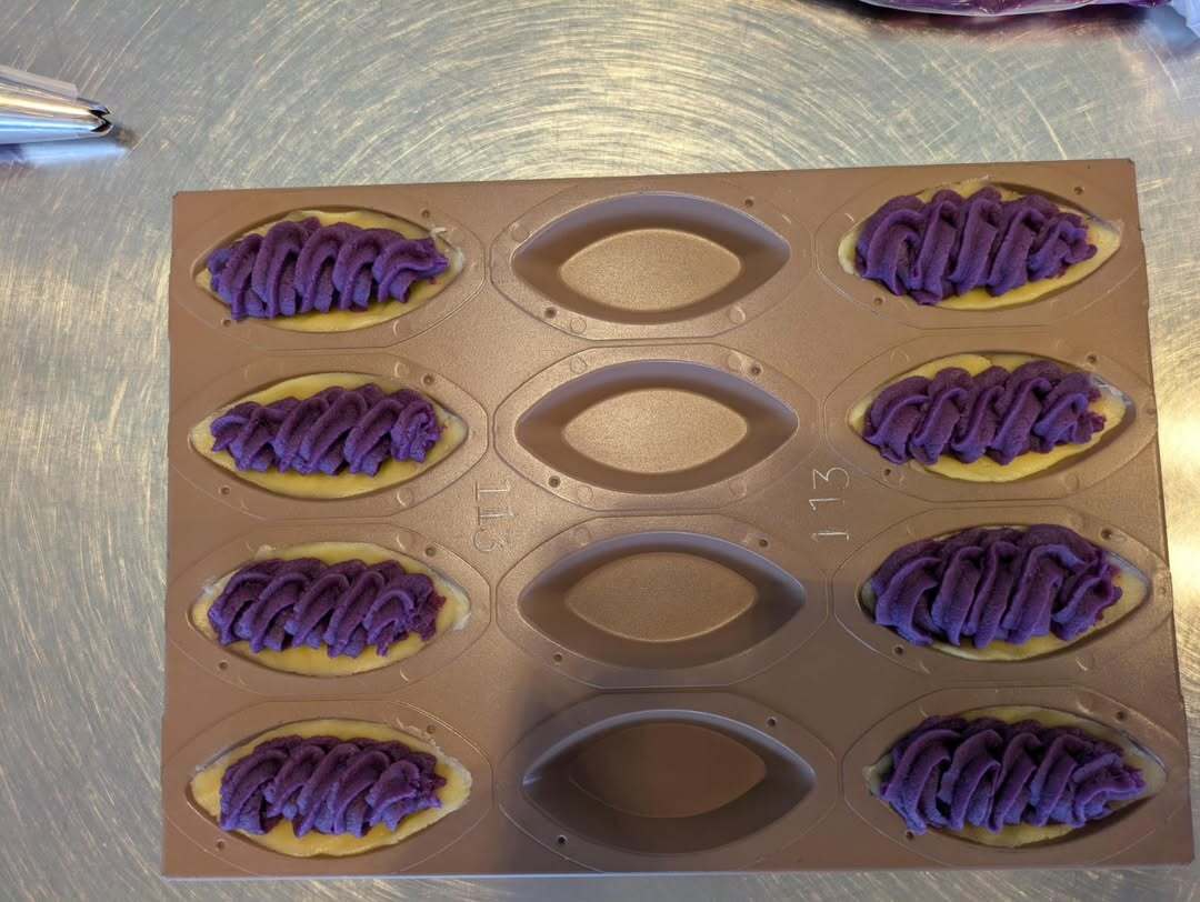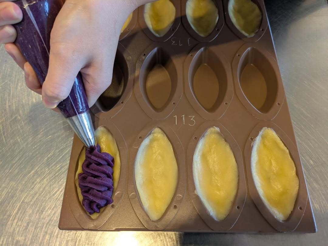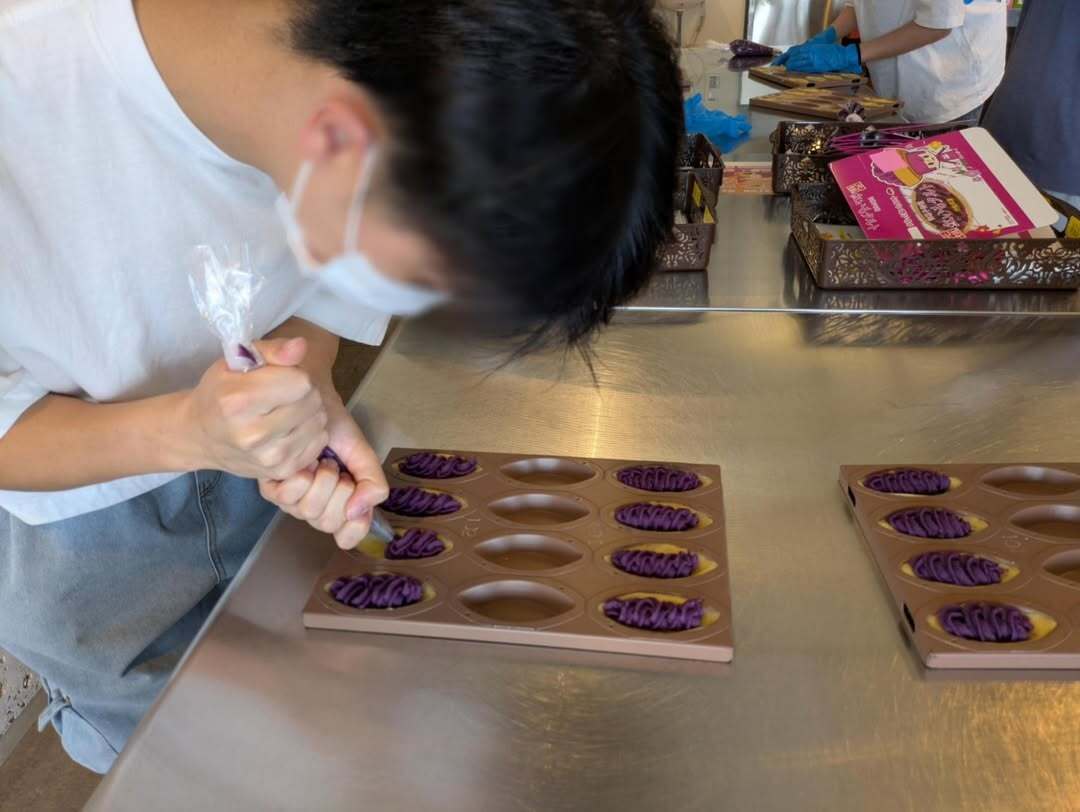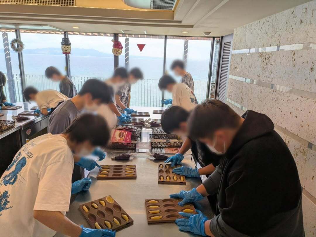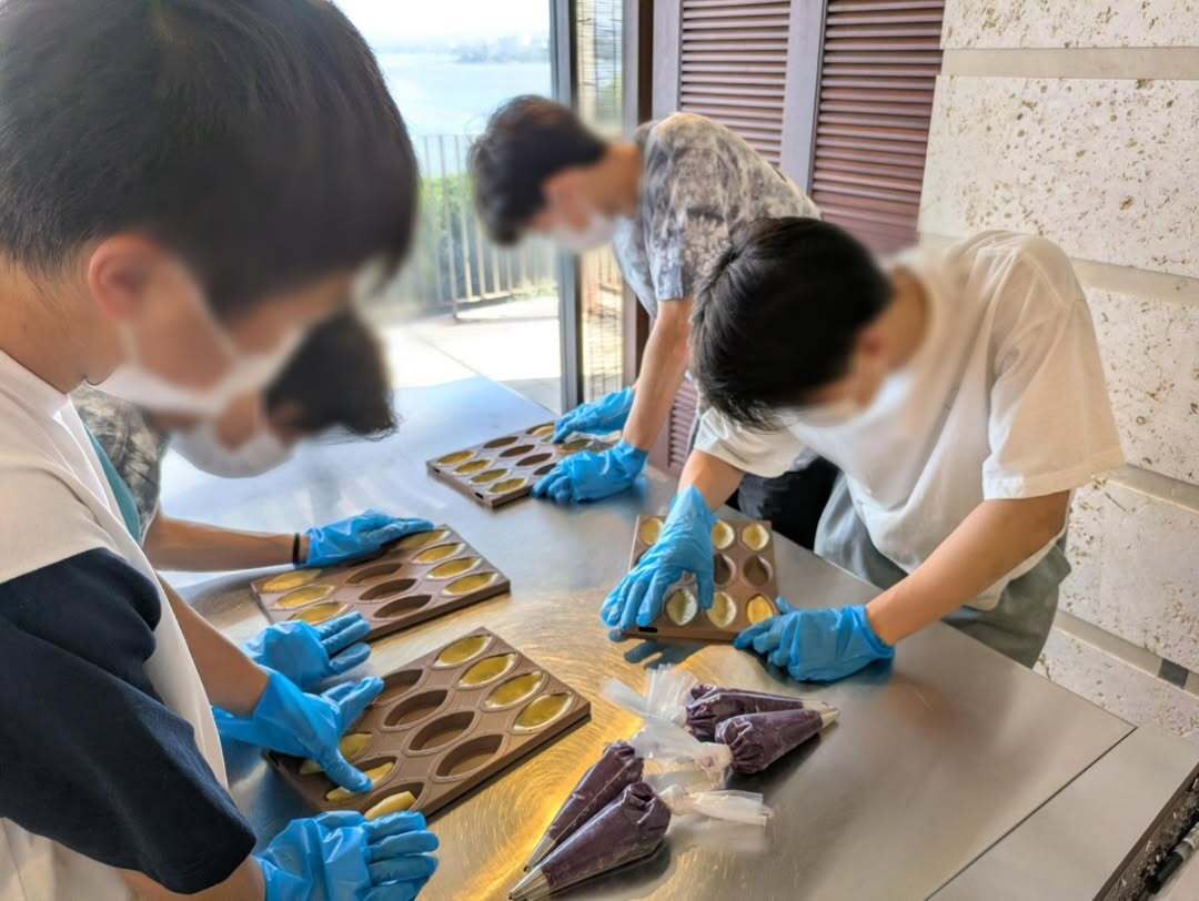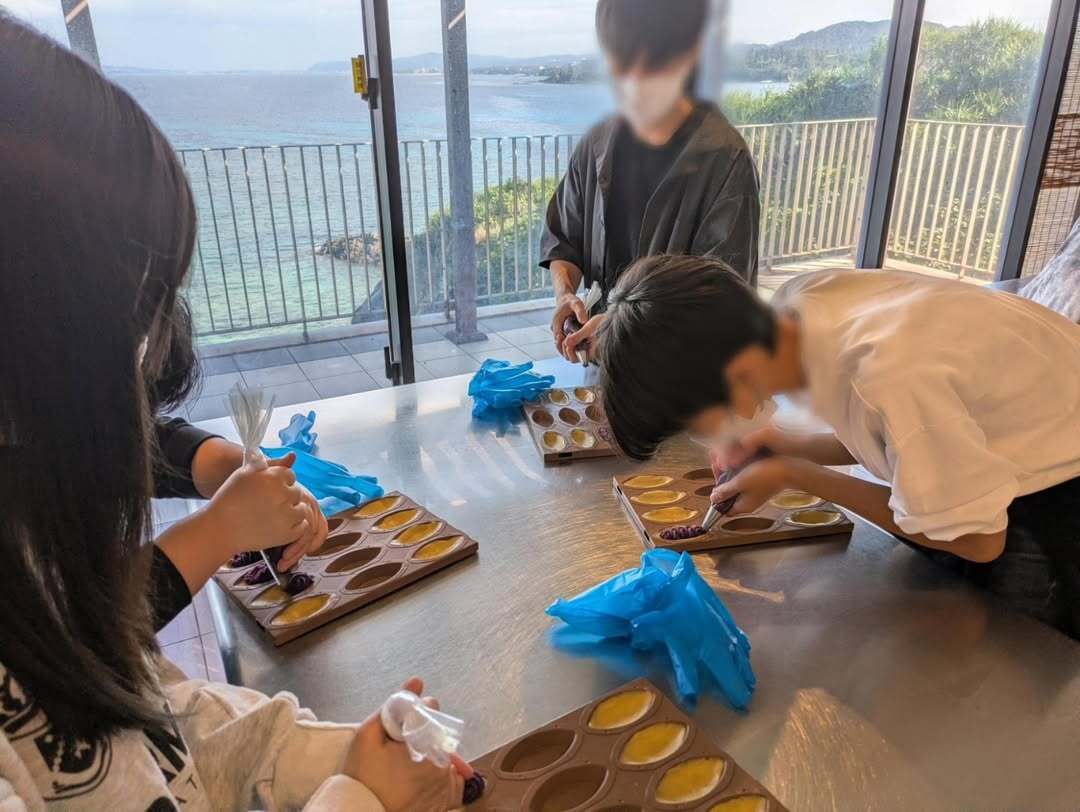 12月2日(火)の午前中に2年食品コースが御菓子御殿恩納店へ紅芋タルトつくり体験に行きました。 タル ト生地を型に敷き詰めて、絞り袋に入った紅芋生地をタルト生地の上に美味しく見えるように絞りました。 そ の際、紅芋生地を厚くたっぷりと絞ると、焼き上げの際に、熱が入りきらないので、加減を考えて行うように と、お店の方から教えていただきました。 その後、パッケージにイラストやコメントを描いて自分だけの紅芋 タルトをお土産として持ち帰ることができました。製造工場の様子も見ることができました。