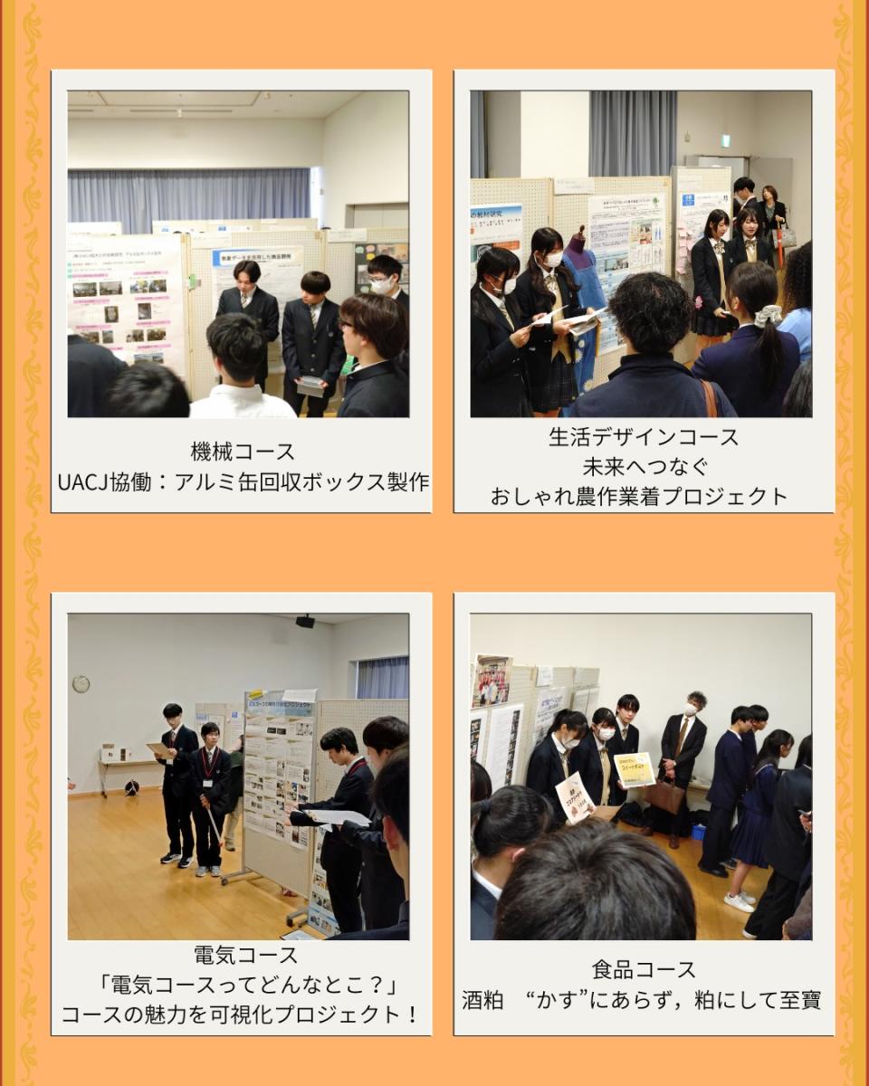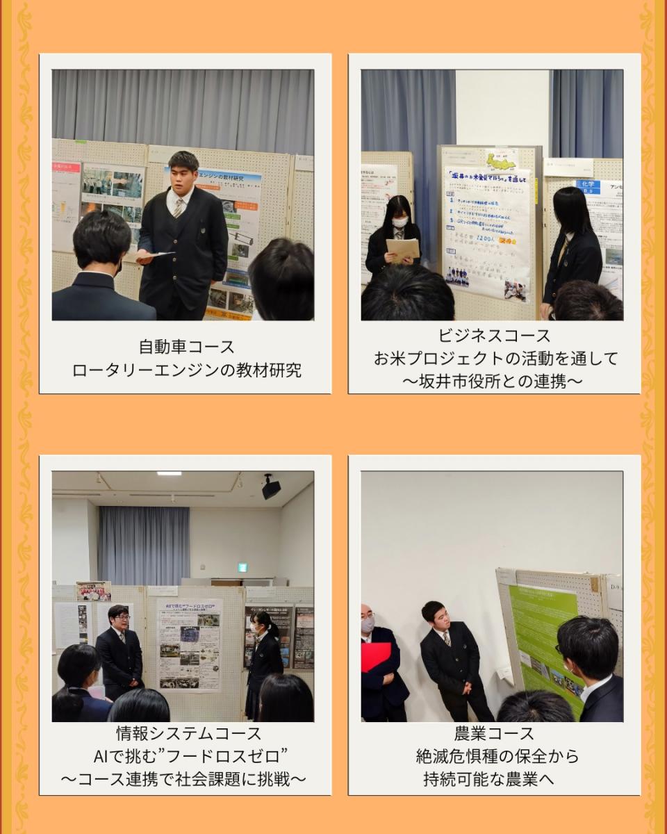 12月23日~25日でアオッサで行われた 『福井県高校生研究フォーラム』へ坂井高校8コース参加してきました。 各コースならではの課題研究の成果を発表していました。 発表を聞いてくださった方から質問を受け、自分た ちの思いや考えをしっかりと答えていたのが印象的でした。 他校の研究を見学に行ったりもしていて、新しい 刺激になったのではないかと思います。