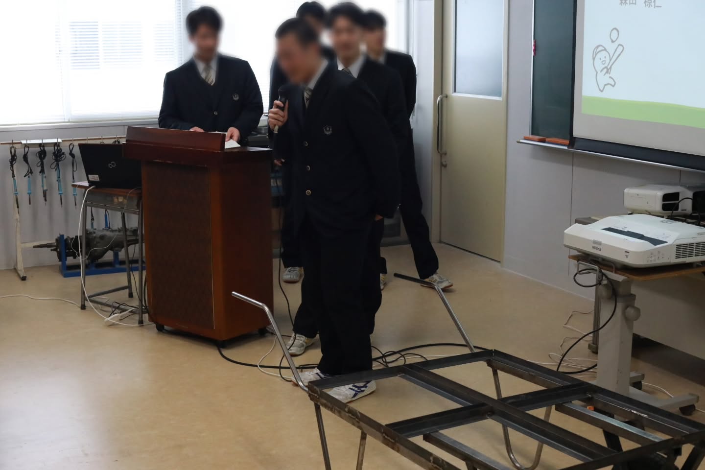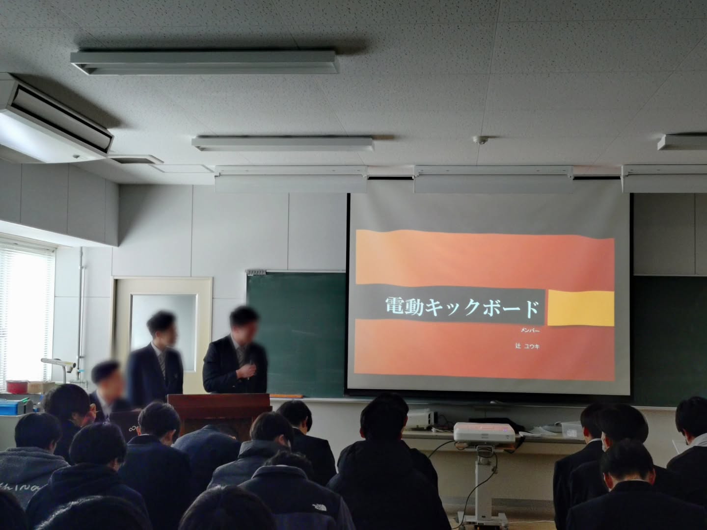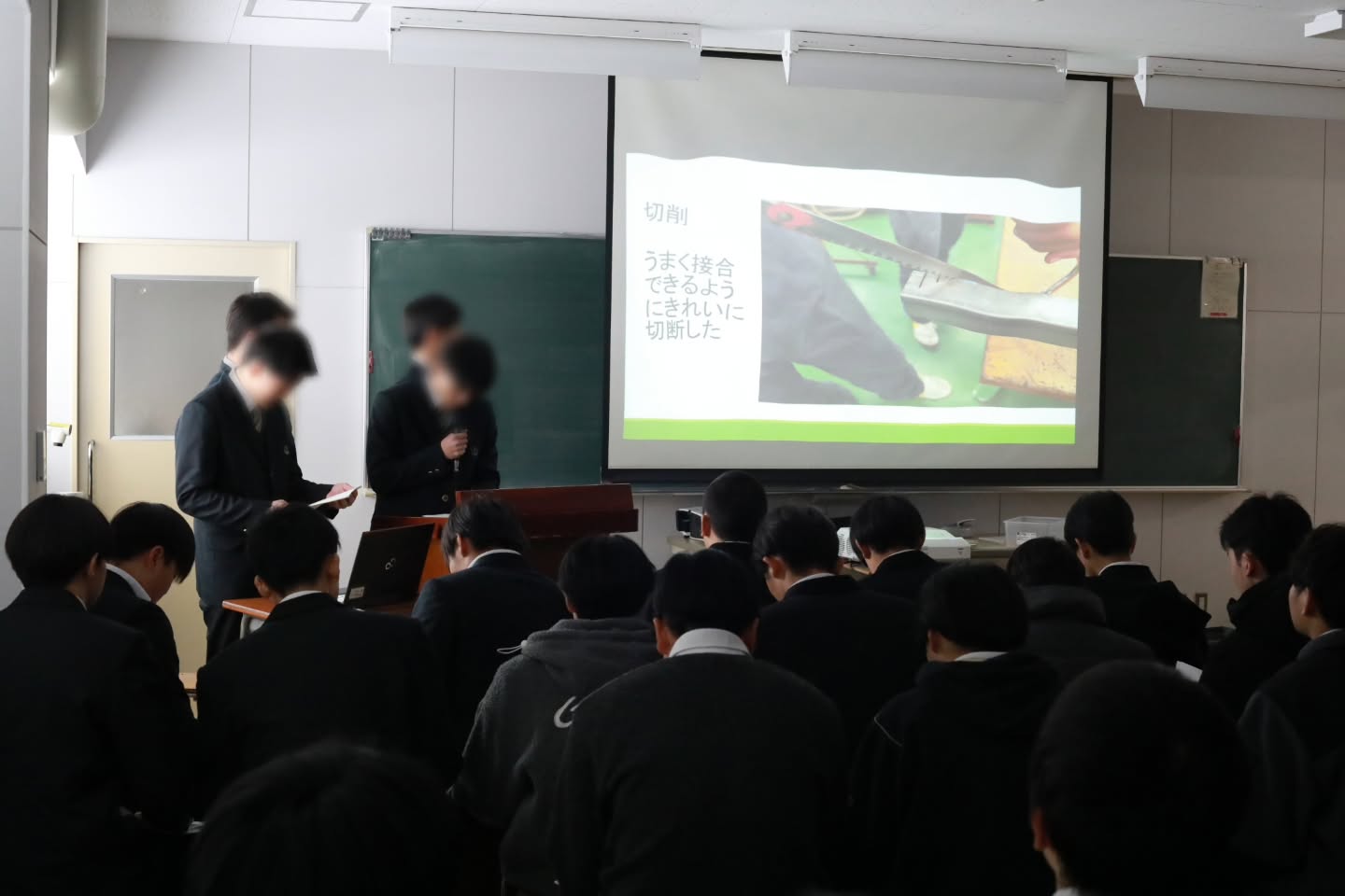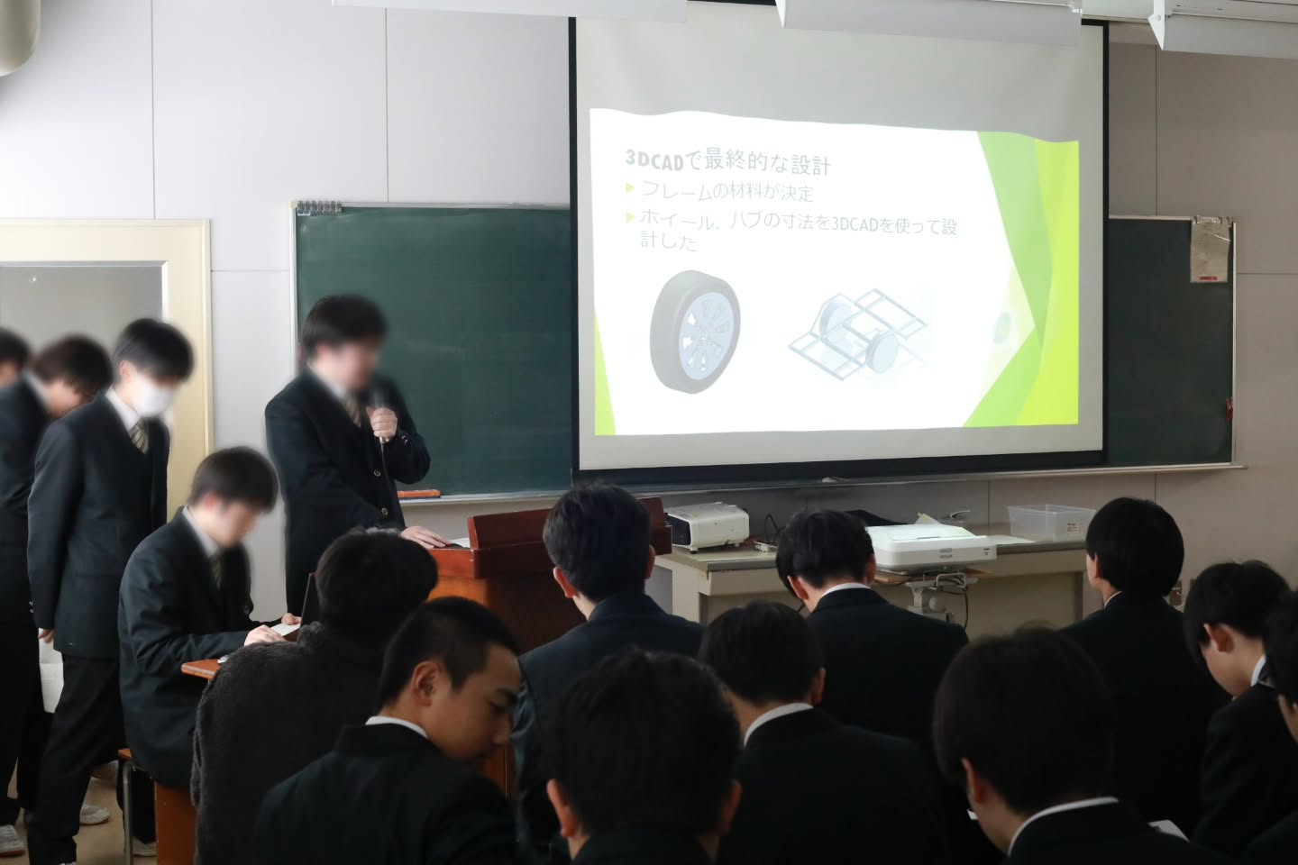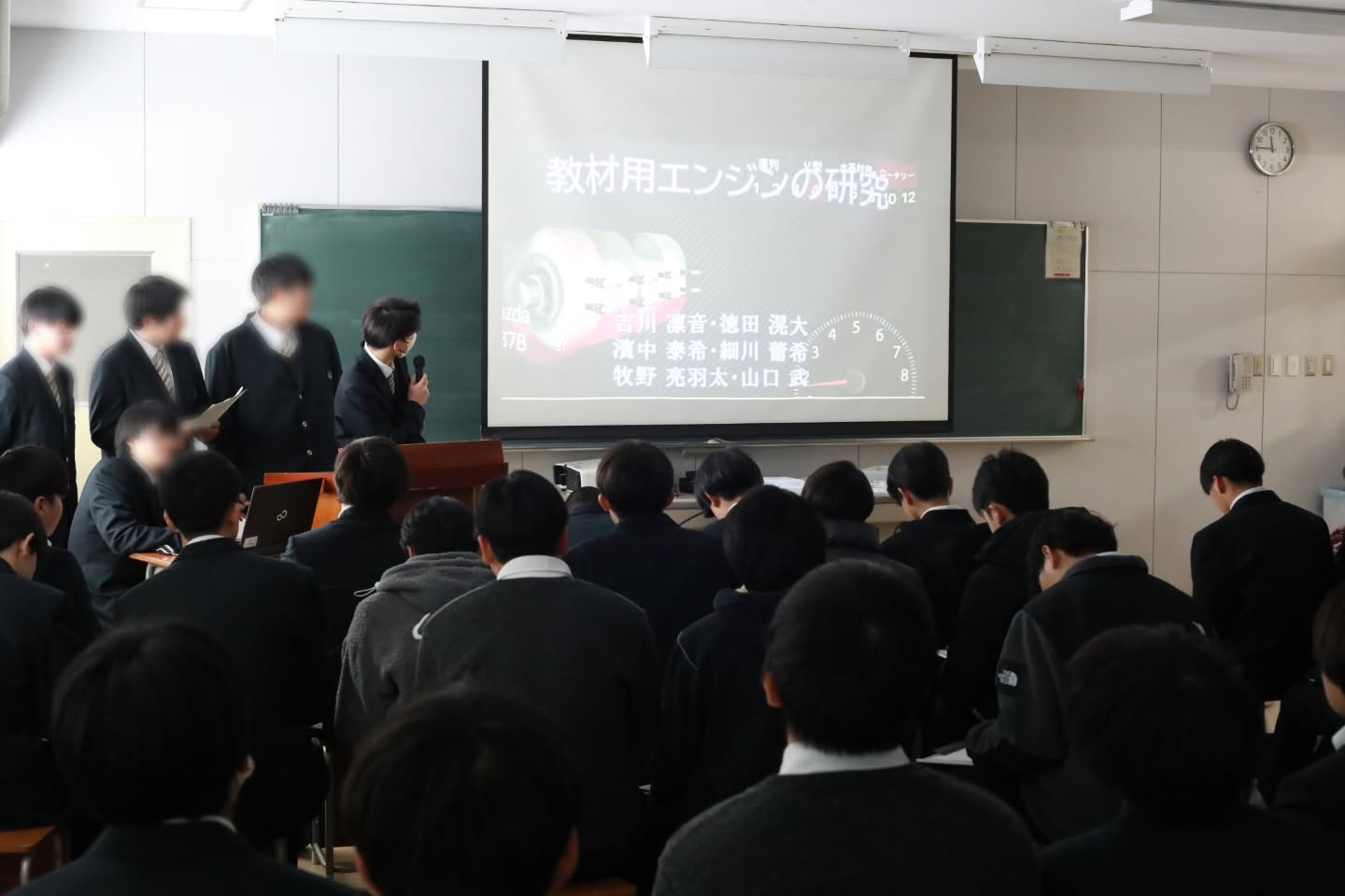 1月26日、自動車コース内にて3年生が1・2年生に向けて課題研究発表会を行いました