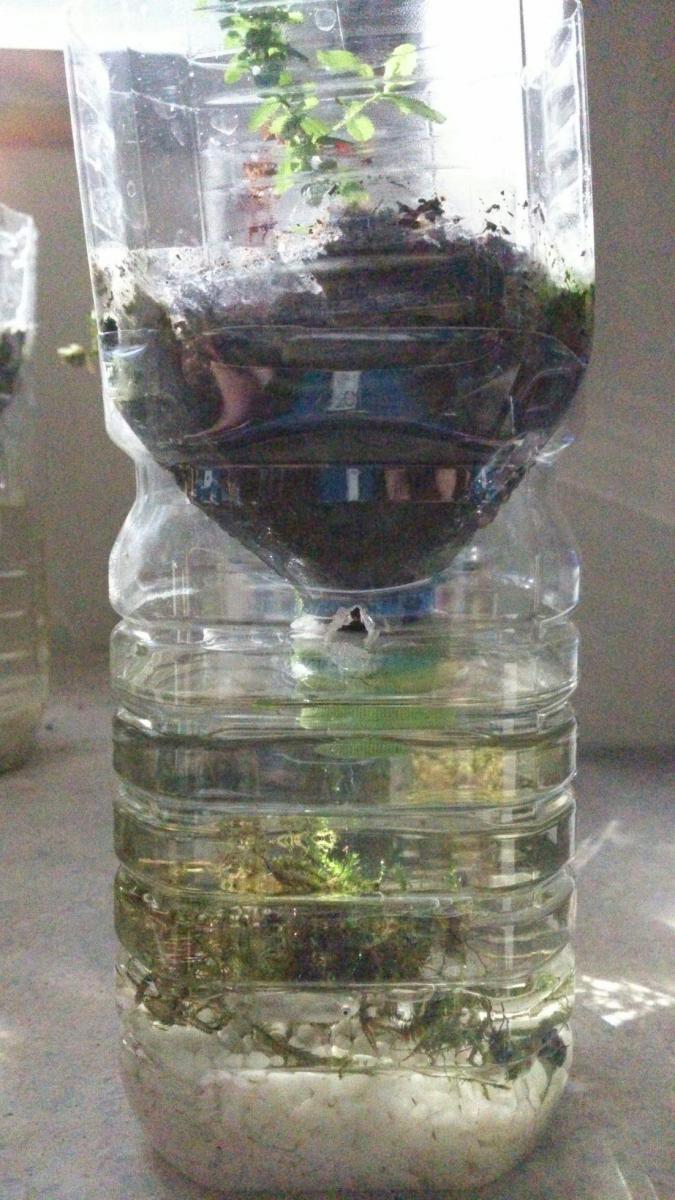 ペットボトルミニ生態系を応用した、アゼオトギリの増殖器を開発した。ペットボトルを1/3のところで切り分け、上のほうを逆さにして下のほうにはめ込む。下には水を入れて、上には土を入れ苗を植えます。キャップにはキリで穴をあけ、ガーゼを通しておくと、必要な分だけ水を吸い上げる仕組みです。