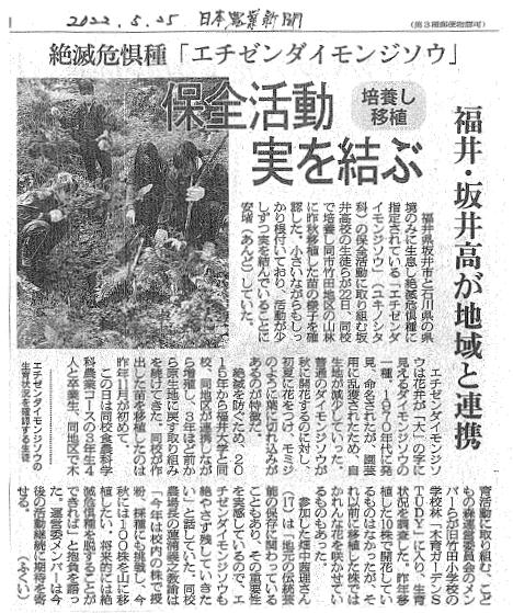 はじめて、エチゼンダイモンジソウの苗を本校で作成し、自生地近くの保全区へ移植できたところを取材していただきました。